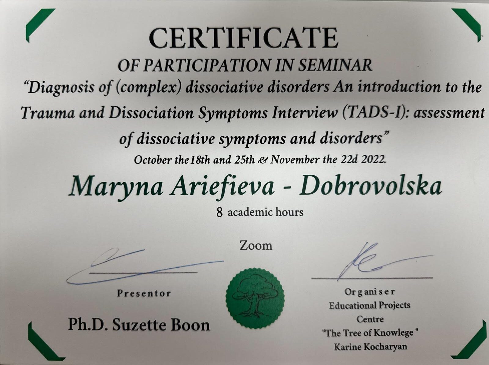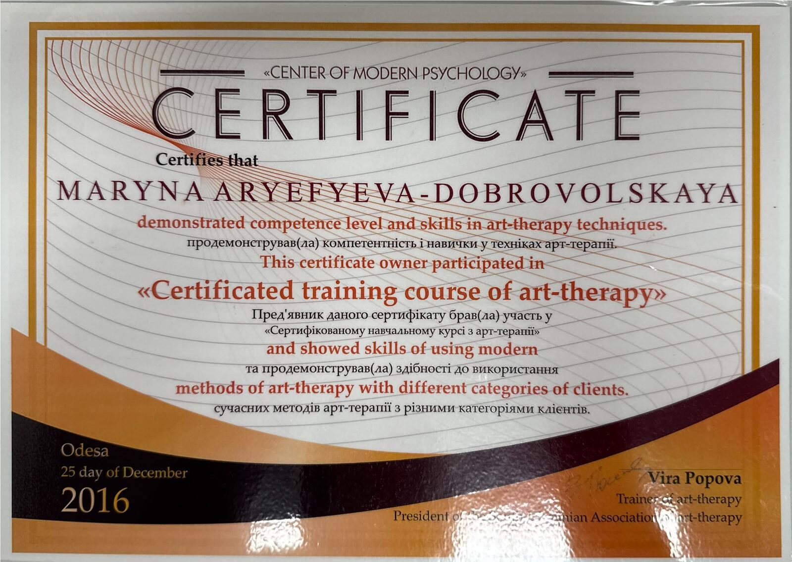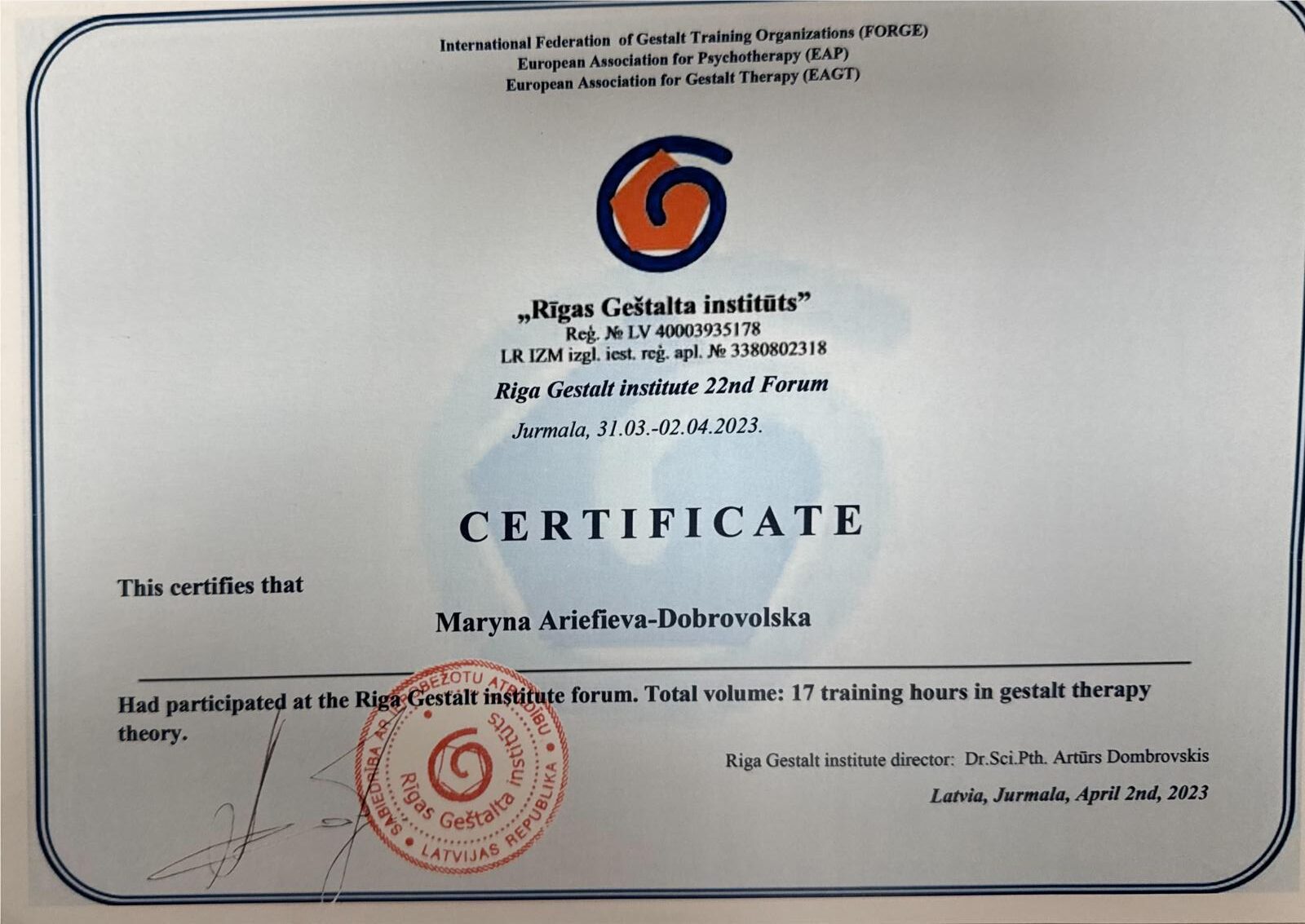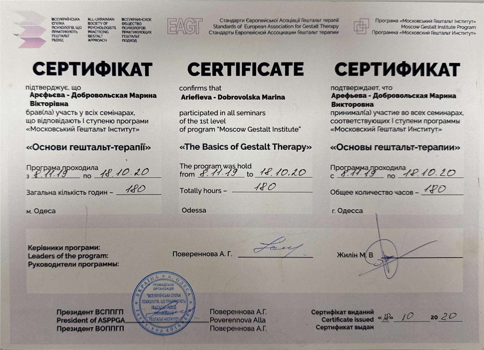 В 2018 году я продолжила профессиональное развитие, начав обучение на гештальт-терапевта. Первую и вторую ступени успешно закончила и получила сертификацию в 2024 году.
